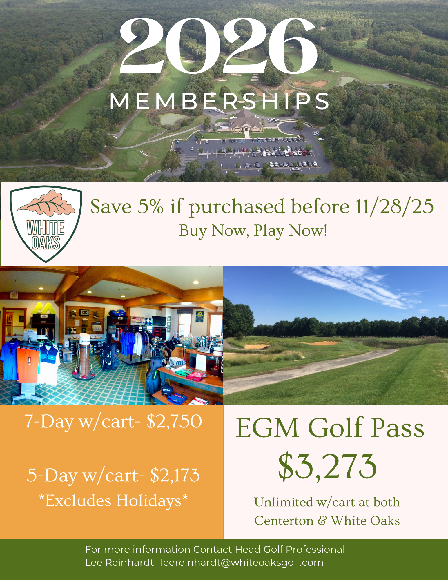 The public is welcome at White Oaks Country Club. For area golfers who play White Oaks often, we offer value-oriented annual membership programs. Group outings, tournaments and special events are superbly managed by the experienced professional golf staff. To relax before or after your round, the 10,000-plus square-foot clubhouse includes the Oak Room, a full-service bar and grille.